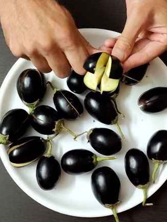 भरवा बैंगन बनाने के लिए मीडियम साइज़ बैंगन ले उसमे बिच से 4 कट लगाए